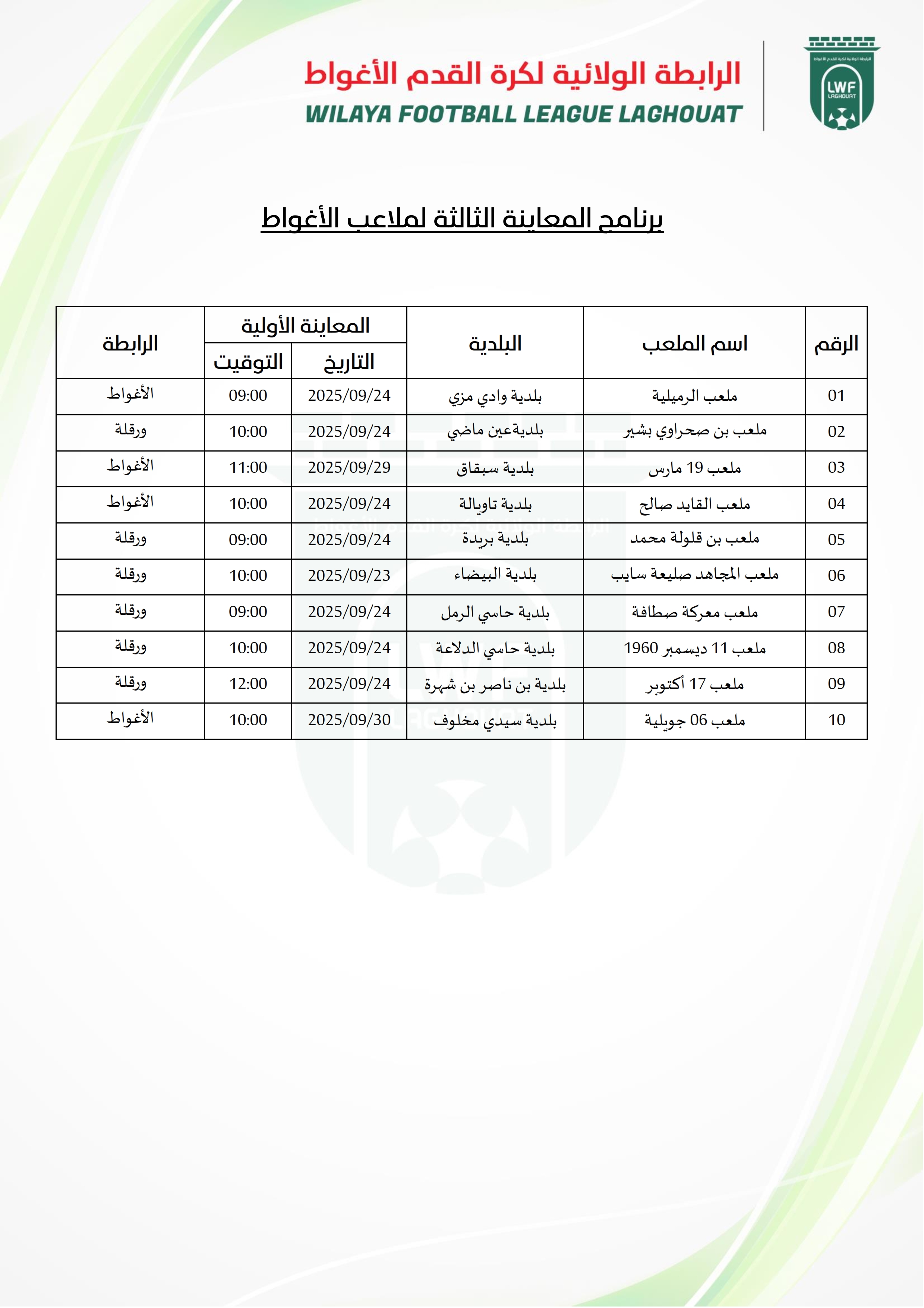 تعلن لجنة معاينة الملاعب للرابطة الولائية لكرة القدم بالأغواط عن برنامج المعاينة الثالثة للملاعب للموسم 2026/2025 وفق الجدول بالأسفل وعليه المطلوب من النوادي :