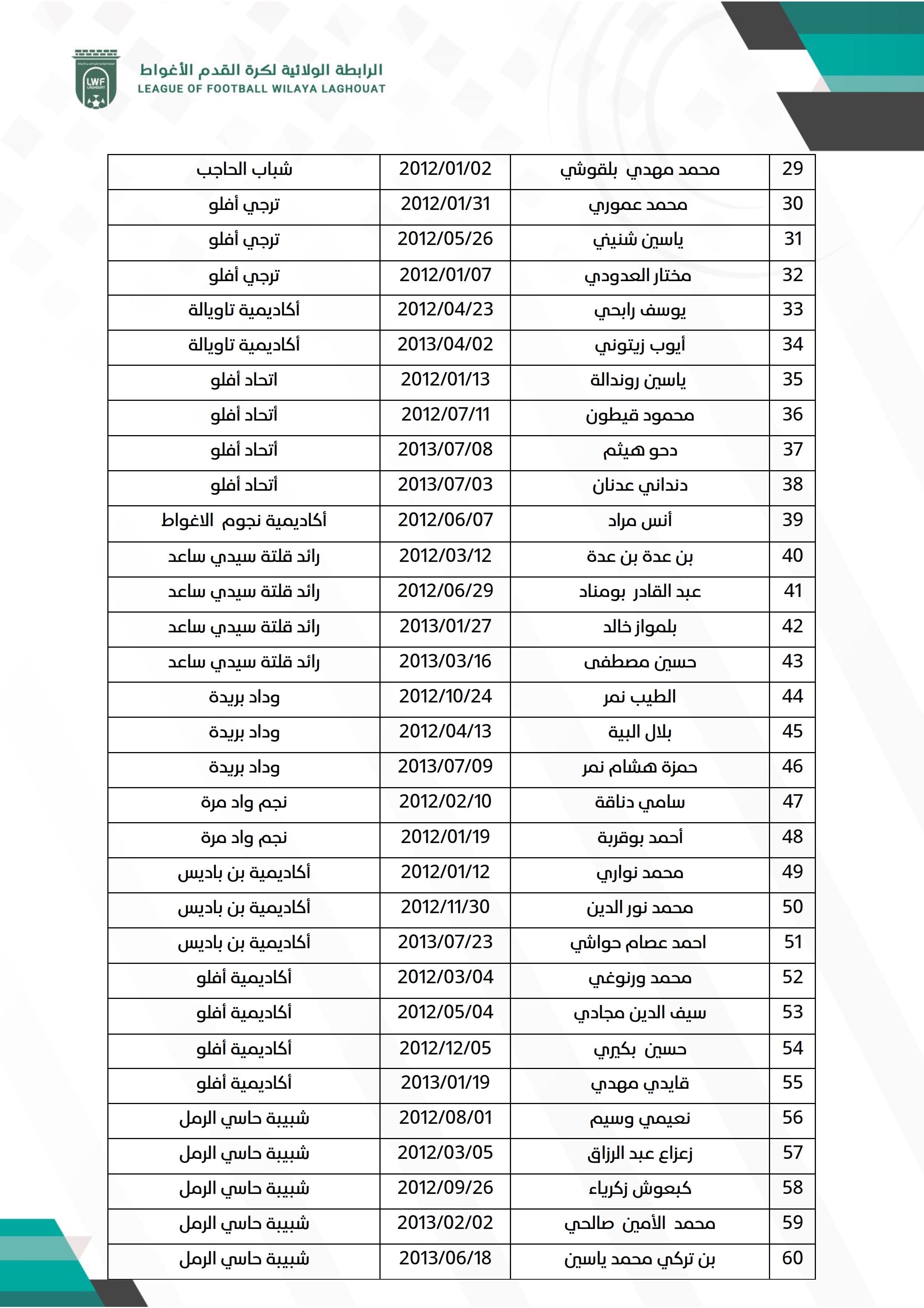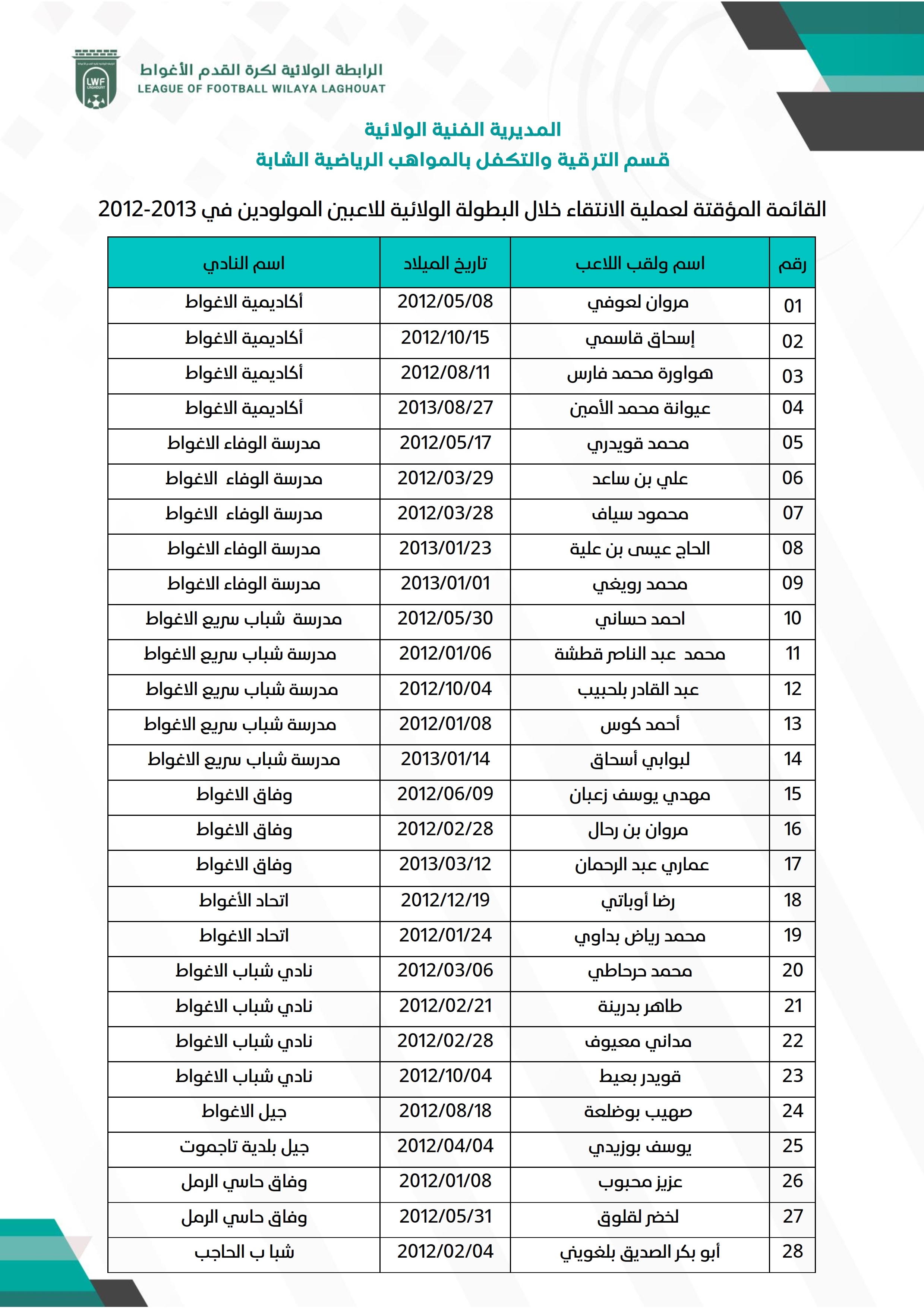 تبعاً لبرنامج المديرية الفنية للرابطة الجهوية لكرة القدم ورقلة فيما يخص عملية الانتقاء، تدعوا الرابطة الولائية لكرة القدم الأغواط اللاعبين المذكورين في القوائم بالأسفل الحضور إلى ملعب المركب الرياضي 18 فبراير يوم السبت 2025/12/13 ابتداءً من الساعة 08:00 صباحاً