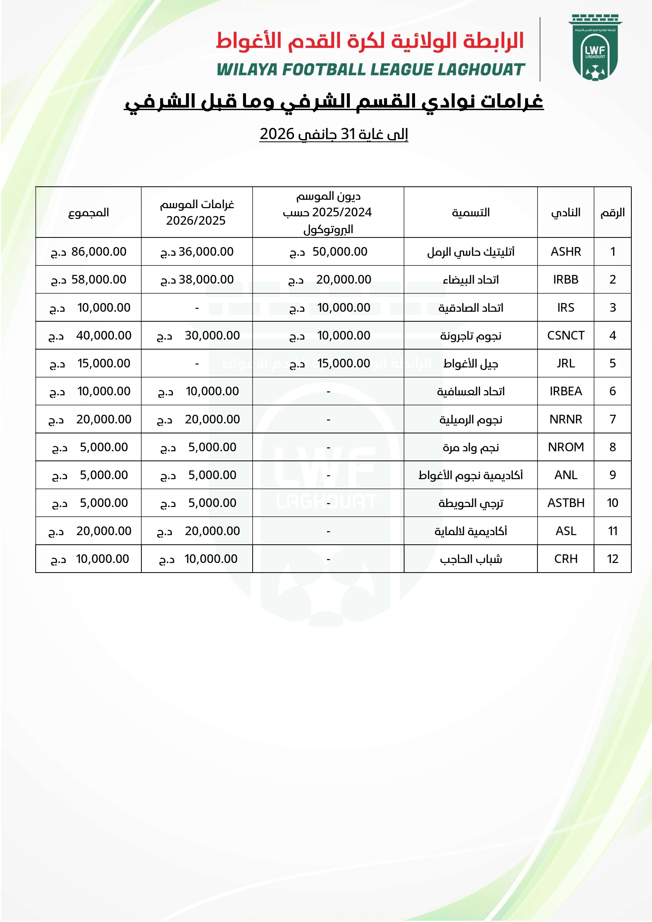 سيتم ارسال إعذارات للفرق التي لم تُسدد الغرامات المستحقة بتاريخ 01 مارس 2026